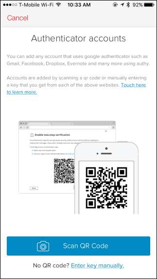 Az Authy engedélyezve van. Csak meg kell látogatnia a választott fiókszolgáltatás kétfaktoros hitelesítési beállítási oldalát, és fel kell húznia egy QR-kódot, mintha egy új Google Authenticator alkalmazást állítana be. Ezt követően koppintson az „Hozzáadás” gombra az Authy képernyő alján található fiókban, és szkennelje be a QR-kódot. A fiók hozzá lesz adva az Authy szolgáltatáshoz.