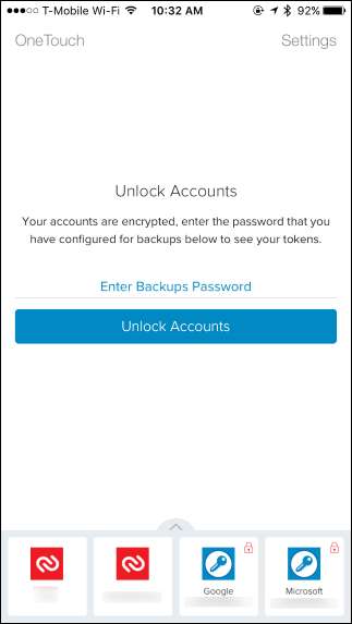 Ha hitelesít, az az eszköz, amellyel bejelentkezik, hozzáférést kap fiókjaihoz. Azonban nem fogja azonnal hozzáférni a kódjaihoz. Ha biztonsági kódot állított be a kódok kódolásához a felhőben, akkor az Authy-ban található kódok mellett egy zár ikon jelenik meg. A kódok tényleges eléréséhez meg kell adnia biztonsági mentési jelszavát.