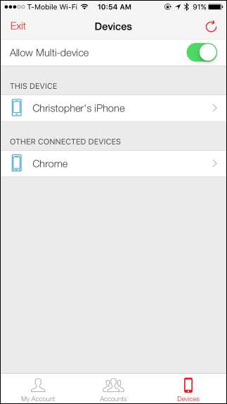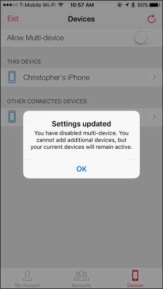 Miután hozzáadta az összes kívánt eszközt, menjen vissza a Beállítások> Eszközök elemre az Authy alkalmazásban, és tiltsa le a „Több eszköz engedélyezése” lehetőséget. A többeszközös szinkronizálás továbbra is normálisan fog működni, csak nem fog tudni új eszközöket hozzáadni. Ez jó dolog, mivel az eszközök hozzáadása SMS-t használ - ami, amint azt már megbeszéltük, nem biztonságos. Tehát ezt a beállítást csak akkor szeretné bekapcsolni, ha új eszközt ad hozzá. Ezután tiltsa le utána.