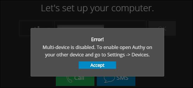 Ne feledje azonban, hogy ha letiltja a több eszközt, és új eszközre kell bejelentkeznie - például talán csak a telefonján volt Authy, és a telefonja elveszett, megrongálódott vagy ellopták -, akkor nem fogja tudni megtenni így. Megjelenik egy üzenet, amely szerint a több eszköz le van tiltva, és újra engedélyeznie kell.