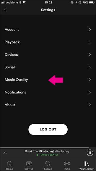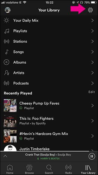 Nyissa meg a Spotify alkalmazást, lépjen a Saját könyvtár fülre, és koppintson a jobb felső sarokban található Beállítások ikonra. IOS rendszeren válassza a Zene minőség lehetőséget. Androidon görgessen lefelé, amíg meg nem találja.