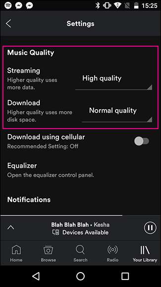 Az egyik hangminőséget beállíthatja a streaminghez, a másikat pedig a letöltött számok . Ne feledje, minél magasabb a bitráta minél több adatot fog használni a streaming során és minél több helyet foglalnak el a számok letöltéskor.