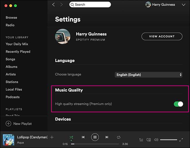 A Spotify Premium segítségével hozzáférhet a jobb minőségű zenei streaminghez. Alapértelmezés szerint (és ha az ingyenes csomagot választja), a Spotify 96kbps sebességgel folyik mobilon és 160kbps sebességgel a számítógépen. Nál nél ezek a fajta bitráták , hallani fog egy kicsi, de észrevehető minőségromlást a CD-hez képest.