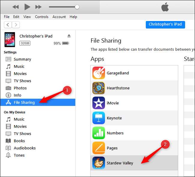 Kattintson a Fájlmegosztás ”Elemet a bal oldali ablaktáblán, és az Alkalmazások listában válassza a„ Stardew Valley ”lehetőséget. Az iPhone-on vagy iPaden található bármely Stardew Valley-mentési fájl itt jelenik meg a „Stardew Valley Documents” részben.