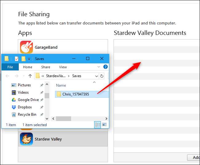 Karakter másolásához a PC-ről vagy a Mac-ről az iPhone-ra vagy iPad-re csak húzza át az egész karakter mappát az iTunes Stardew Valley Documents területére.
