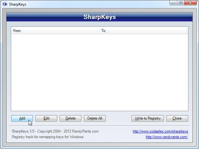 Telepítse a SharpKeys szoftvert, nyissa meg, majd kattintson a Hozzáadás gombra egy új kulcs újratervezéséhez.
