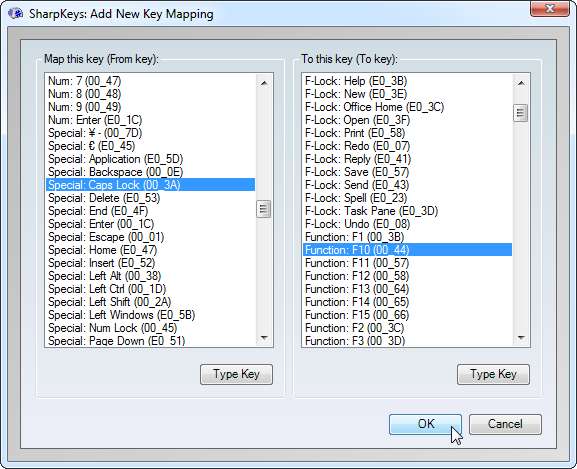 A „Különleges: Caps Lock” kulcs hozzárendelése egy nem használt kulcshoz. Például nagyon kevesen használják az F10 billentyűt bármire, ezért a Caps Lock-ot a „Funkció: F10” -re fogjuk térképezni. Ha F10-et használ, érdemes egy másik F-billentyűt választania, amelyet soha nem használ.