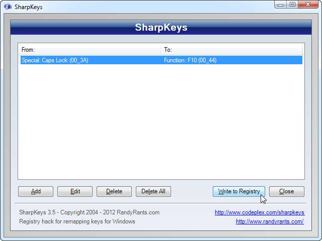 Kattintson az Írjon a nyilvántartásba gombra, és a SharpKeys megírja a kulcs újratervezését a rendszerleíró adatbázisban, elvégezve a piszkos munkát az Ön számára.