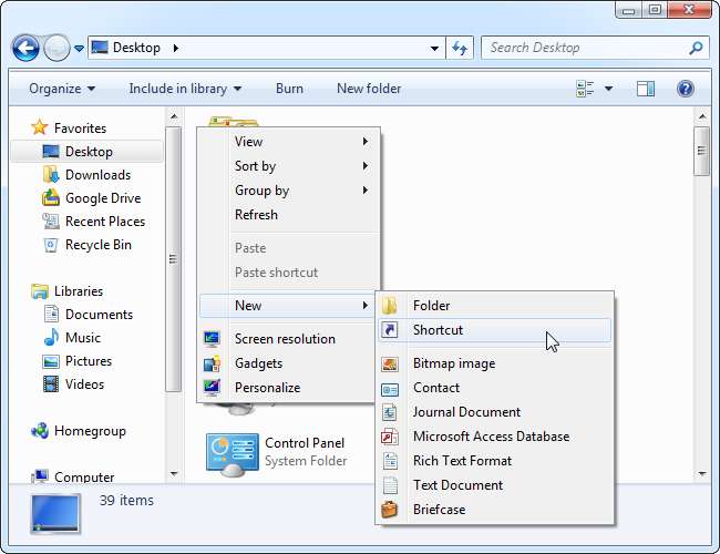 Kattintson a jobb gombbal a mappában, mutasson az Új elemre, és válassza a Parancsikon lehetőséget.