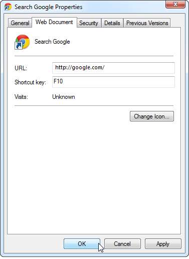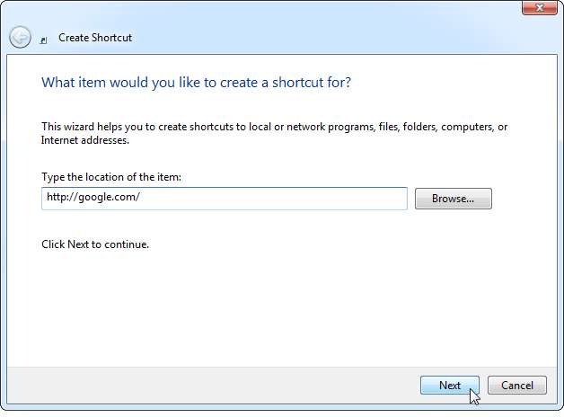 Létrehozunk egy Chrome OS stílusú parancsikont, amely a Google-on keres, ezért belépnénk http://google.com/ a hely mezőbe.
