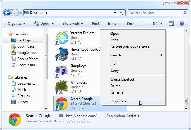 Kattintson a jobb gombbal az imént létrehozott parancsikonra, és válassza a Tulajdonságok parancsot.