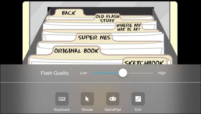 A menü a Flash minőségének megváltoztatására, valamint a képernyőn megjelenő egér és a gamepad engedélyezésére vonatkozó lehetőségeket tartalmazza.