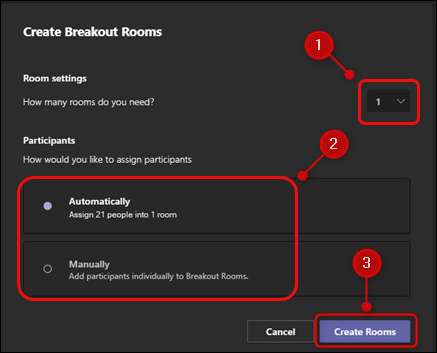 A megnyíló "Hozzon létre Breakout Rooms" panel, válassza ki a kívánt kitörési helyek számát (legfeljebb 50-ig), válassza ki, hogy a résztvevők automatikusan vagy manuálisan kerülnek-e, és kattintson a "Szobák létrehozása" gombra.