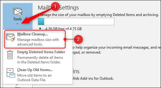 Először meg kell nyitnia az eszközt. Menjen a Fájl> Eszközök elemre, és kattintson a Postafiók tisztítása elemre.