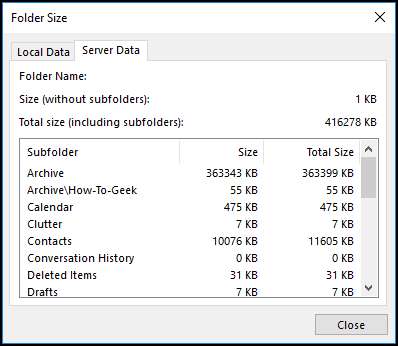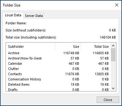 Ez megnyitja a Mappa méret ablakot, amely megmutatja az egyes mappák méretét. Alapértelmezés szerint a Helyi adatok fülön nyílik meg. A helyi adatok azok az adatok, amelyeket a számítógépen a .pst és.ost fájlokban tárolnak.