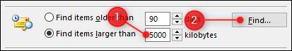 Ez nagyon hasznos, ha nagy mellékletekkel rendelkező leveleket szeretne találni, amelyeket törölhet, vagy az Outlookról merevlemezre vagy felhőszolgáltatásra helyezheti át. Például, ha minden 5 MB-nál nagyobb levelet szeretne keresni, akkor módosíthatja a „Nagyobb tételek keresése” mezőt 5000 kb-ra, majd kattintson a „Keresés” gombra.