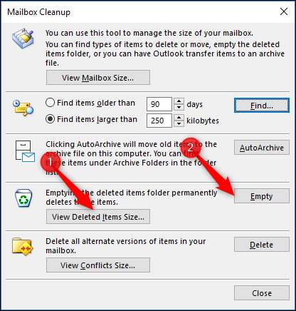 Kattintson a „Törölt elemek méretének megtekintése” elemre, hogy megnézze, mennyi helyet foglalnak a törölt elemek, majd vegyen egy mély lélegzetet, és kattintson az „Üres” gombra.