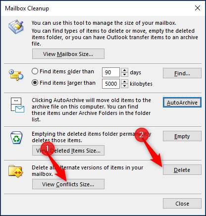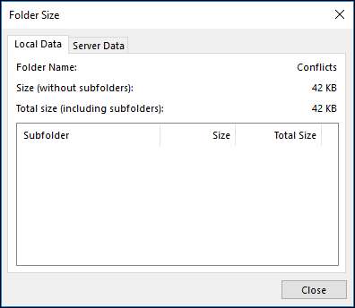 A Mailbox Cleanup utolsó lehetősége az ütközési üzenetek törlése. Ezek olyan e-mailek, amelyekről az Outlook úgy gondolja, hogy ütköznek egy meglévő e-maillel, mert ugyanazok a fejlécinformációk. Általában ennek oka az ideiglenes szinkronizálási probléma az Exchange szerverrel, és képesnek kell lennie arra, hogy gond nélkül törölje ezeket az e-maileket. Ha meg szeretné tudni, hogy van-e e-mailje a Konfliktusok mappában, kattintson a „Konfliktusméret megtekintése” gombra a Mappaméretek ablak szűrt verziójának megtekintéséhez.