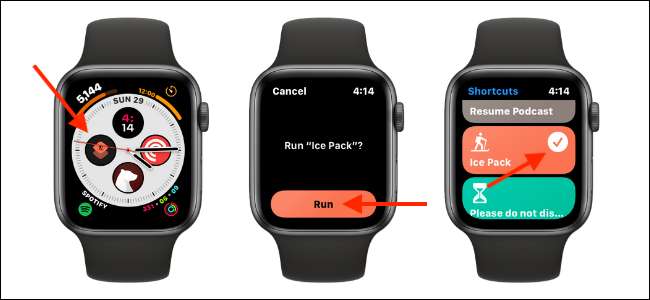A parancsikon kiváltásához egyszerűen érintse meg a Watch Face parancsikonját. Ezután érintse meg a "RUN" gombot a parancsikon futtatásához.