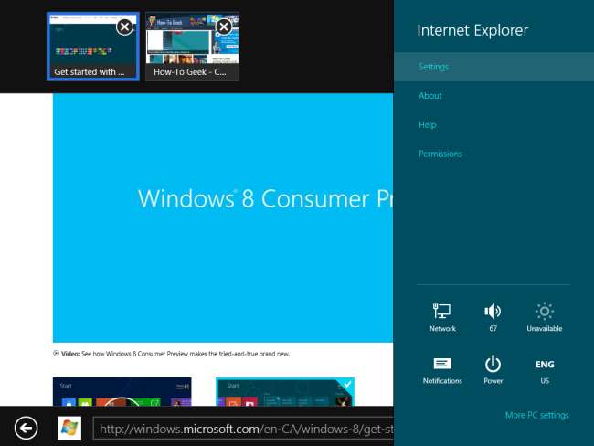 A varázslat kontextus-érzékeny. Ha az Internet Explorer Metro verziójában rákattint a Beállítások varázslatra, megkapja az Internet Explorer beállításait.