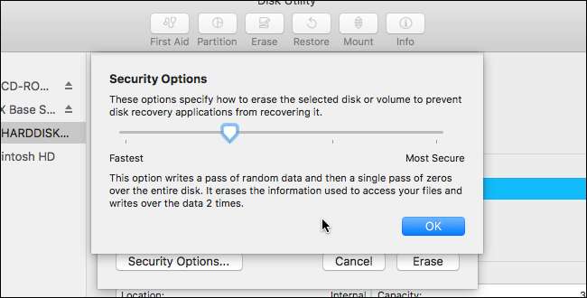 Ha döntött, kattintson az „OK” gombra, de ne feledje: ha a Mac-je szilárdtestalapú meghajtóval rendelkezik, akkor nem kell használnia ezeket a lehetőségeket. Csak adjon nevet a meghajtónak (csak a következetesség kedvéért javaslom a „Macintosh HD” -t), majd kattintson az „Erase” gombra a felülírás megkezdéséhez.