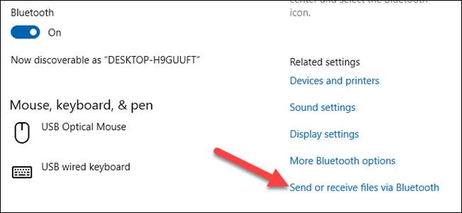 Vissza a Windows PC-n, nyissa meg a "Bluetooth & amp; Egyéb eszközök "Beállítások menü ismét. Ezúttal kattintson a "Küldés vagy fájlok küldése a Bluetooth-on keresztül" a kapcsolódó beállítások oldalsávon.