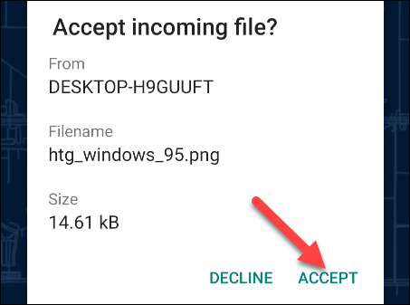Egy "bejövő fájl" értesítés jelenik meg az Android-eszközön. Érintse meg, és válassza az "Elfogadás" lehetőséget az előugró ablakból.