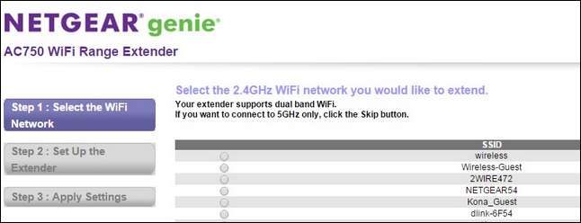 A csatlakozás után, függetlenül a kívánt módtól, Wi-Fi-kompatibilis eszközzel kell csatlakoznia az egységhez. Ehhez a feladathoz laptopot vagy mobileszközt használhat, mivel a telepítővarázsló mobilra van optimalizálva. A bővítő a Wi-Fi listán NetgearEX6100_2GEXT néven jelenik meg. Csatlakozzon hozzá, majd irányítsa készüléke böngészőjét a http://mywifiext.net címre, hogy bejelentkezzen az extenderbe és elindítsa a telepítővarázslót.