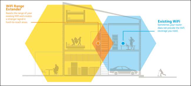 Az alapgondolat, amint azt a felülvizsgálat bevezetőjében említettük, az, hogy a hatótávolság-kiterjesztőt az eredeti Wi-Fi-jel ernyőjébe helyezzük, hogy az meg tudja fogni és kiterjessze azt. Nem akarja, hogy az extender túl közel legyen az útválasztóhoz (mivel nincs szüksége külön jelre, ha maga az útválasztó hatótávolságában van), és nem akarja túl messzire helyezni az útválasztótól mert nem lesz megismételendő jele. Az EX6100 kézikönyve egyszerű ábrát kínál a megfelelő elhelyezés kiemelésére.