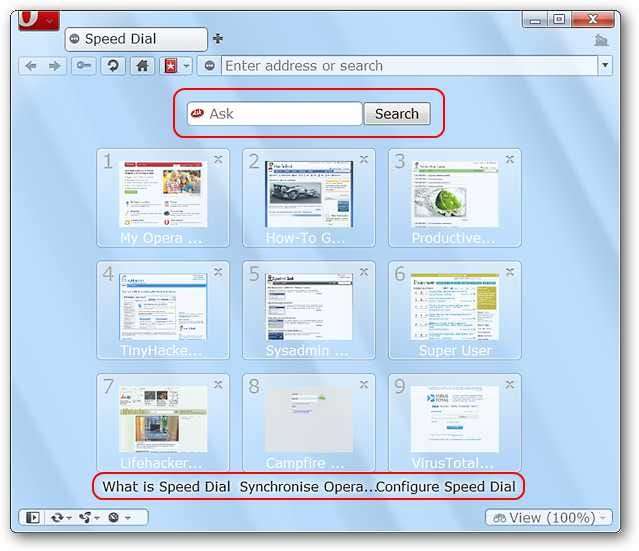 Az alul található keresősáv és szöveg helyet foglal el, és rendetlenséget kölcsönöz az Opera Gyorshívó oldalának megjelenésének.