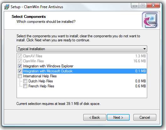 A ClamWin telepítése egyszerű és egyszerű. Az egyetlen dolog, amit ellenőrizni kell, hogy a Microsoft Outlook összetevő be van-e ellenőrizve, ha Outlookot használ.