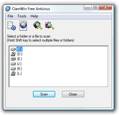 A ClamWin felhasználói felület egyszerű és egyszerű. Más segédprogramokkal ellentétben nincs feltűnő vagy divatos grafika, csak válassza ki a meghajtót, és indítsa el a vizsgálatot.