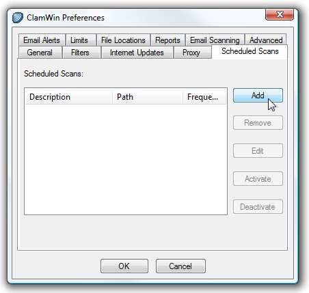 A beolvasás ütemezéséhez kattintson az Ütemezett vizsgálatok fülre, ahol észreveszi, hogy alapértelmezés szerint nincs beállítva semmi. Új ütemezés létrehozásához kattintson a jobb oldalon található Hozzáadás gombra.