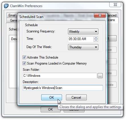 Megnyílik az Ütemezett vizsgálat mező, és beállíthatja a vizsgálat gyakoriságát (napi, munkanap. heti vagy havi ), az idő és a hét melyik napja, ha a heti beolvasási lehetőséget választja. Itt át is böngészhet a beolvasni kívánt mappába, majd létrehoz egy leírást.