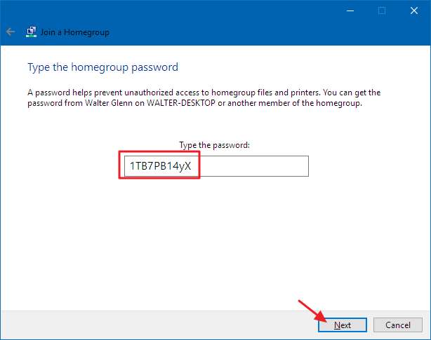 Írja be a házcsoport jelszavát, majd kattintson a „Tovább” gombra. Ha nem tudja a jelszót, lépjen a hálózat egyik másik számítógépéhez, amely már tagja a Homegroupnak, indítsa el a Homegroup vezérlőpult alkalmazást, és ott megkeresheti.