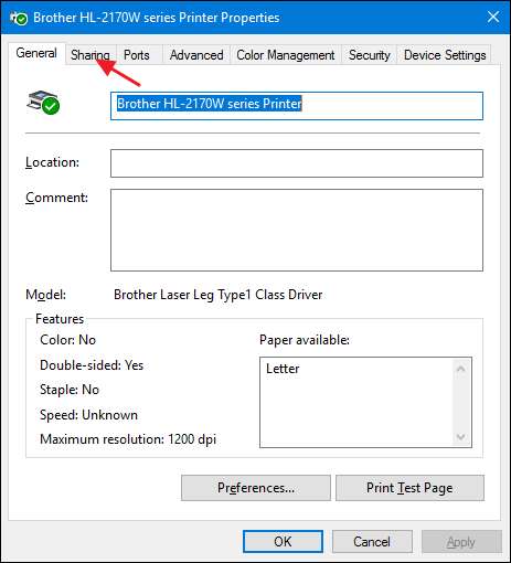 A „Nyomtató tulajdonságai” ablak mindenféle dolgot megmutat, amelyet konfigurálhat a nyomtatóval kapcsolatban. Most kattintson a „Megosztás” fülre.