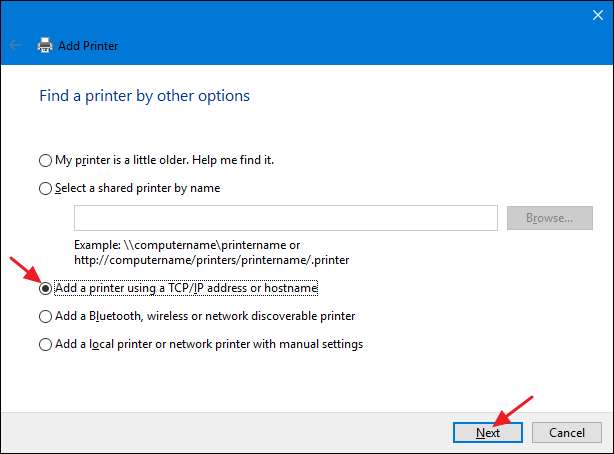 Meg fogja találni, hogy ezek a lehetőségek meglehetősen egyszerűek, és rövid varázslókkal szolgálnak a folyamat végigviteléhez. Mivel a TCP / IP a legbiztosabb módja a nyomtató hozzáadásának, ezt folytatjuk példaként. Válassza a „Nyomtató hozzáadása TCP / IP-címmel vagy hosztnévvel” lehetőséget, majd kattintson a „Tovább” gombra.