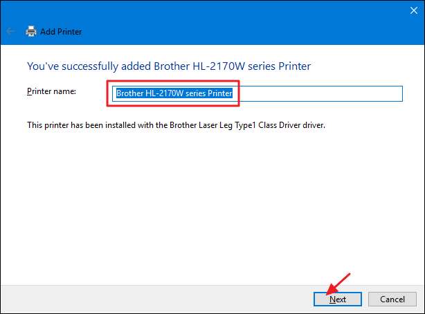 Írjon be egy új nevet a nyomtatóhoz, ha az alapértelmezett név nem felel meg Önnek, majd kattintson a „Tovább” gombra.