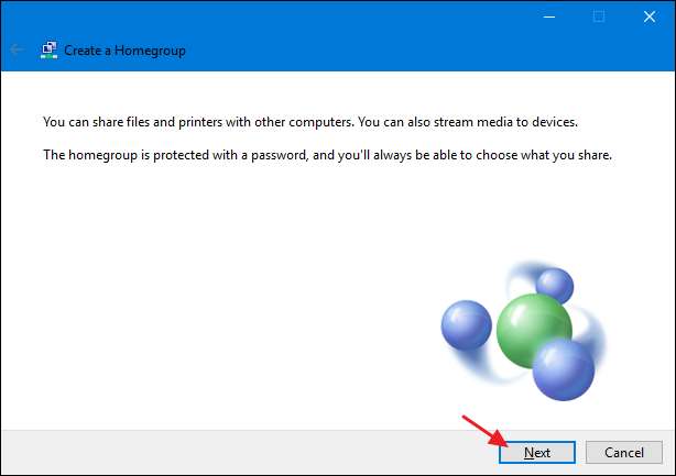Ha már van egy otthoni csoport, amely a hálózat többi PC-jéhez készült, de a PC, amelyhez csatlakoztatta a nyomtatót, nem tagja, a Homegroup vezérlőpult alkalmazás indításakor a főképernyő az alábbihoz hasonlít. Kattintson a „Csatlakozás most” gombra, majd a következő képernyőn kattintson a „Tovább” gombra, amely csak egy kicsit tájékoztat a házi csoportokról.