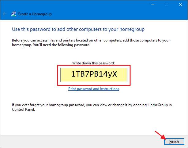Az utolsó képernyőn megjelenik az a jelszó, amelyre a hálózat többi számítógépéhez szüksége lesz a házi csoporthoz való csatlakozáshoz. Írja le, majd kattintson a „Befejezés” gombra.