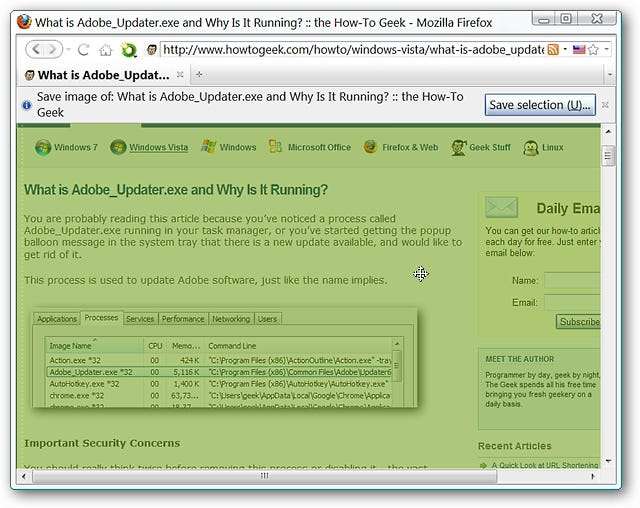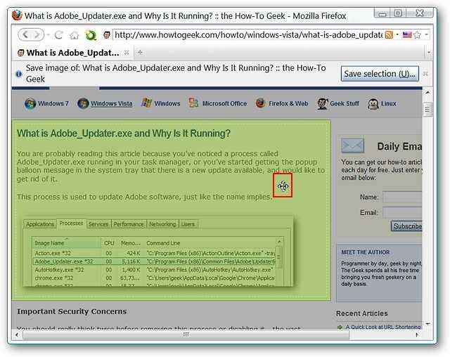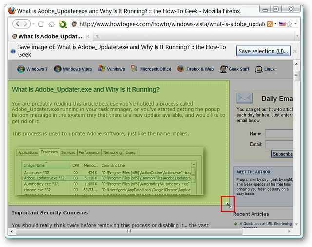 Talán csak egyszerre van szüksége az egész oldalra ... kattintson duplán a bal egérgombbal a weboldal területére, és a teljes weboldal kiválasztásra kerül a képernyőképhez. A kívánt terület kiválasztása után csak a „Mentés gombra” kell kattintania.