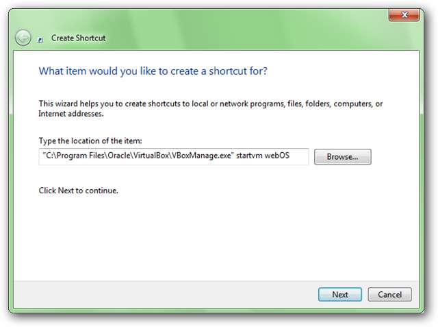 Készíthet parancsikont a virtuális gép közvetlen elindításához is. Kattintson a jobb gombbal az asztalra, és hozzon létre egy új parancsikont. Az elemmező helyén keresse meg a VBoxManage futtatható fájlt. A legtöbb esetben a fő programfájlokban található az Oracle \ VirtualBox mappában. Ezután írja be startvm webOS (vagy bármit neveztek el a virtuális gépünknek).