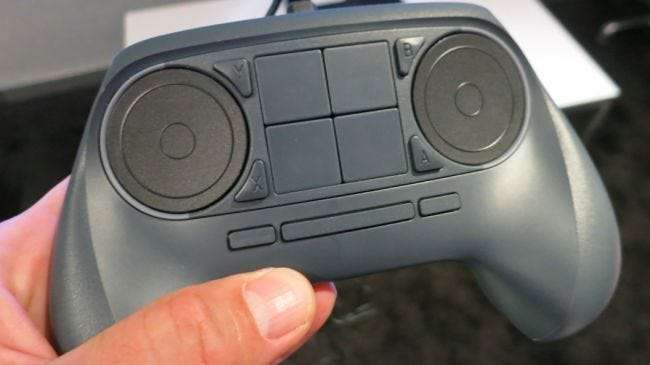 Ami ezt a munkát teszi, az a Steam Controller, amely analóg botok helyett érintőpadokat használ a mozgáshoz és a játék körülnézéséhez. A bal oldali párnát a játékban mozoghatjuk, míg a jobb oldali betétet egérrel utánozzuk a PC-s játékban, és meglepően jól működik. Ez az első alkalom, hogy valaki kitalálta, hogyan lehet a PC-s játékélményt a nappaliba vinni egér pontosságával, de a nappali számára barátságosabb konzol stílusú vezérlőben.