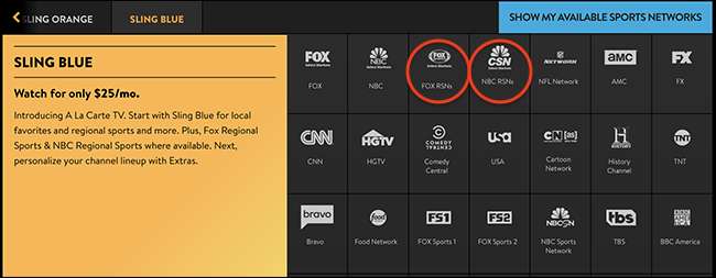 Mint látható, a Sling kék csomagja a legolcsóbb módja e regionális sportközvetítések elérésének: 25 dollár, és vagy a Comcast / NBC, vagy a Fox regionális hálózattal rendelkezik.