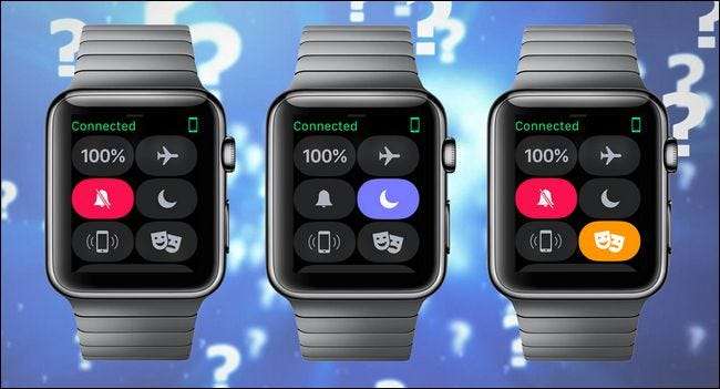 Három mód áll rendelkezésre az Apple Watch felhasználói számára: Néma, Ne zavarjanak, és a legújabb, Színház - a fenti képen balról jobbra látható. Mindhárom mód be- és kikapcsolható, ha egyszerűen felfelé csúsztatja az Apple Watch arcát az óra Vezérlőközpontjának eléréséhez, és egyszerűen megérinti az adott mód ikonját. A következőket teszik: