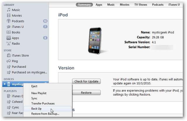 Először csatlakoztassa a régi iPod-ot és készítsen biztonsági másolatot. Csak kattintson a jobb gombbal az eszközre az iTunes alkalmazásban, és válassza a Biztonsági mentés lehetőséget.
