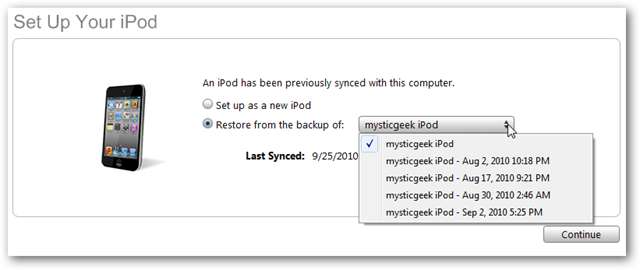 Most, amikor beállítja, választhatja, hogy új iPod-ként állítja be, vagy biztonsági másolatból állítja vissza. Itt választjuk ki a legújabb biztonsági másolatot, majd kattintsunk a Folytatás gombra.