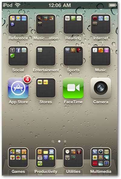A helyreállítás befejezése után örömmel tapasztaltuk, hogy minden adatot sikeresen átküldtünk a 4. generációs iPod Touch készülékre, beleértve a régi eszközön létrehozott mappákat is. Aztán természetesen megvan az új kiemelt funkciók, mint a FaceTime és a Camera alkalmazás.