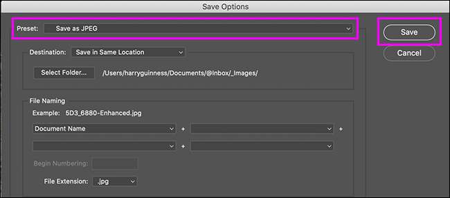 A „Preset” legördülő a Save Options ablakban válassza a „Mentés JPEG”. Ezután kattintson a "Mentés" gombra.