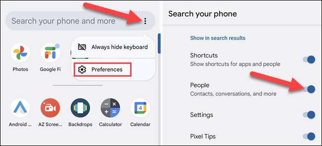 A keresések során megjelenő megjelenések testreszabásához érintse meg az App fiók tetején található három dot menü ikonját, és válassza a "Beállítások" lehetőséget. A kategóriák be- vagy kikapcsolhatók.